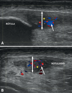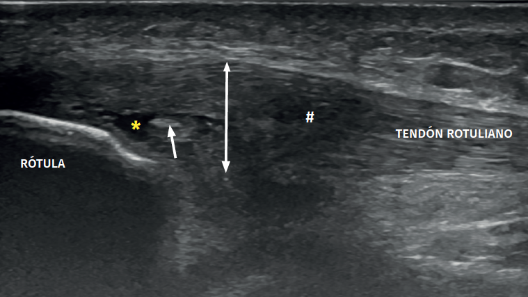 It is also common to identify cortical irregularities in the proximal enthesis of the tendon at the point where it joins the patella, involvement of the paratendon and adherences to Hoffa's fat pad. Any calcifications will be seen as white hyperechogenic zones (Figure 5).