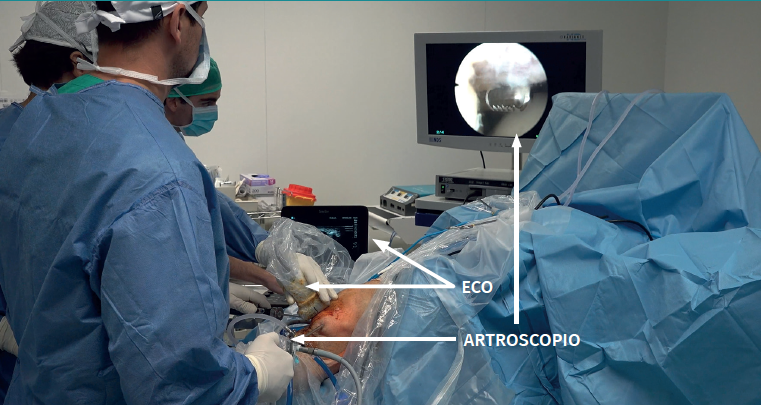 The patient is placed in supine decubitus, and an arthroscopic exploration is made to analyse possible lesions associated to PT. The surgeon must have direct vision on the ultrasound system and arthroscopy tower (Figure 8). Two portals are used - anterolateral and anteromedial - located slightly lower than when used to perform meniscectomy. Ultrasound-guided debridement of Hoffa's fat pad adjacent to the paratendon is carried out. It is advisable not to use a tourniquet, in order to allow ultrasound visualization of hypervascularization zones and their elimination using a synoviotome. In the presence of intra-substance rupture, careful debridement is required, with removal of the possible distal osteophyte in the patella.