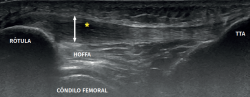 The most common MRI finding is increased signal intensity in the lower pole of the patella, with local widening of the affected zone of the tendon (Figure 7)(14,25). The most evident advantage of MRI with respect to ultrasound is its capacity to visualise associated lesions in the joint and cartilage, as well as the presence of bone edema and involvement of Hoffa's fat pad (Figure 7). As clear disadvantages, mention must be made of the high cost of the technique and the impossibility of performing exploration in motion or at different angles of flexion of the knee.