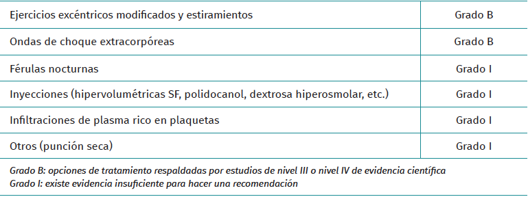 Treatment in the form of exercise and stretching targeted to the insertional region of the tendon has the highest level of recommendation for reducing pain in this location (grade of recommendation B)(1). The effects of exercise can be improved by using a broad range of other treatments, including soft tissue therapy, nutritional supplements, iontophoresis, the modification of physical activity, drug treatments and raising of the heel with plantar support (grade of recommendation I)(33,34,35).