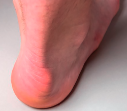 Superficial calcaneal bursitis is often associated to the wearing of shoes with a rigid posterior element. This condition represents an adventitious bursa acquired after birth and which develops in response to friction.