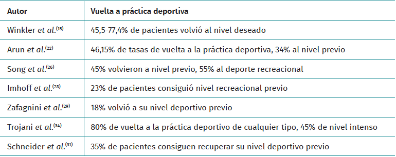 All studies used scales such as the IKDC, Lysholm and/or Tegner scales, although in 3 of them objective instability measures were not defined. As limitations, they show series with little follow-up, retrospective and, in half of them, without a control group.