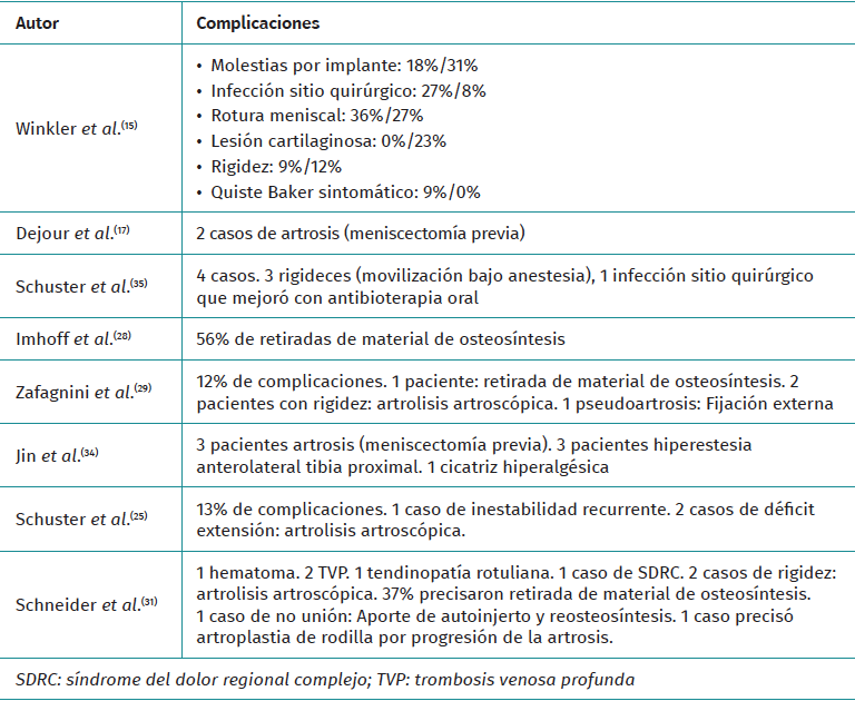 Of those who assessed the coronal profile, 5 of them reflect complications. One study(30) shows up to 12% complications (discomfort from osteosynthesis material, stiffness or pseudarthrosis) and another(35) 13% complications, ranging from instability to stiffness. One case of surgical wound hyperesthesia, one case of postoperative pain and one case of persistent varus due to hypocorrection are described. Of note is the article by Schneider(31), where 37% complained of discomfort from the implant and one patient required revision surgery with total knee arthroplasty (Table 4)(15,17,25,28,29,31,34,35).