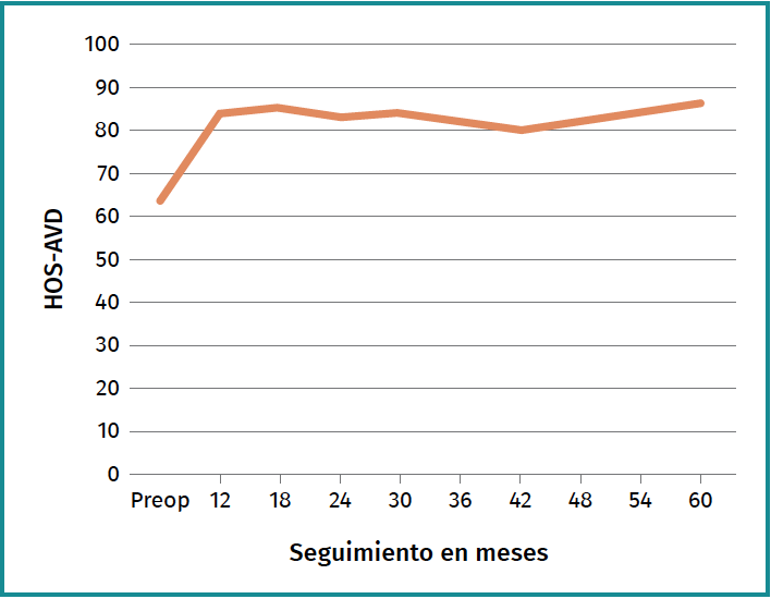 The mean score of the HOS-ADL questionnaire increased significantly at the end of follow-up. The most significant improvement was recorded in the first postoperative year, with no significant difference between the scores at the first and fifth year of follow-up (Table 3 and Figure 2). After 5 years of follow-up, 86.1% of the patients achieved MCID, 71.7% PASS and 61.3% SCB.