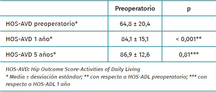 The Hip Outcome Score-Activities of Daily Living (HOS-ADL) questionnaire(13), translated into Spanish and validated(14), was used for clinical assessment. These assessments were made preoperatively, at 6 months, at one year, and annually thereafter. Clinical significance was determined from the minimum clinically important difference (MCID), patient acceptable symptom state (PASS) and substantial clinical benefit (SCB) scores for HOS-ADL at 5-year follow-up. The threshold values for clinical significance were 10.2 points for MCID, 92.2 points for PASS and 94.6 points for SCB(15).