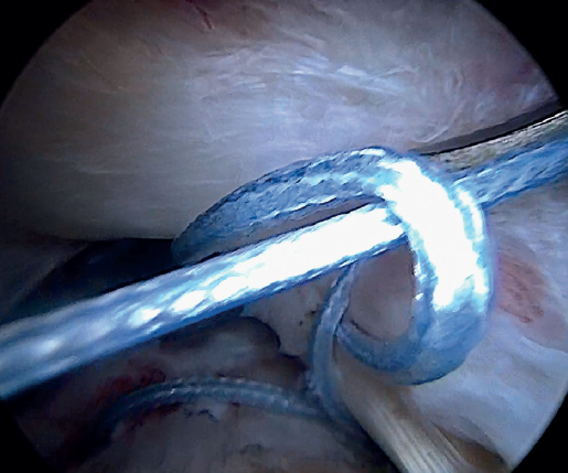 Having passed both the anterior and the posterior sutures, we proceed to knot, through the lateral portal with a working cannula, each of the sutures, starting posterior and ending anterior.