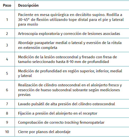 Treatment of large osteochondral lesions of the patella in young patients by fresh osteochondral transplantation provides a high number of viable chondrocytes in the extracellular matrix of the cartilage and restores the normal shape of the patellofemoral joint and its biomechanics. This allows symptomatic and functional improvement with the possibility of delaying or eliminating the need for prosthetic surgery.