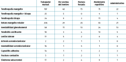 Resultados: las patologías más prevalentes fueron la tendinopatía de manguito con un 32,6% de los pacientes, la ruptura del manguito rotador (RMR) (31,9%) y la inestabilidad glenohumeral (11,1%). Los factores de riesgo más frecuentes observados fueron realizar un trabajo manual de fuerza (55,9% de los casos), con movimientos repetitivos (18,9%) y con movimientos y cargas por encima del hombro (10,9%). Respecto a los mecanismos lesionales, el predominante en la muestra fue el sobresfuerzo (56,7%), la caída (20,8%) y el sobreuso (13,5%). Las patologías que supusieron más días de baja laboral fueron la RMR con 210 (± 12,3) días, la lesión de labrum, con 202,5 (± 36,3) días y la capsulitis adhesiva con 202,5 (± 36,3) días.