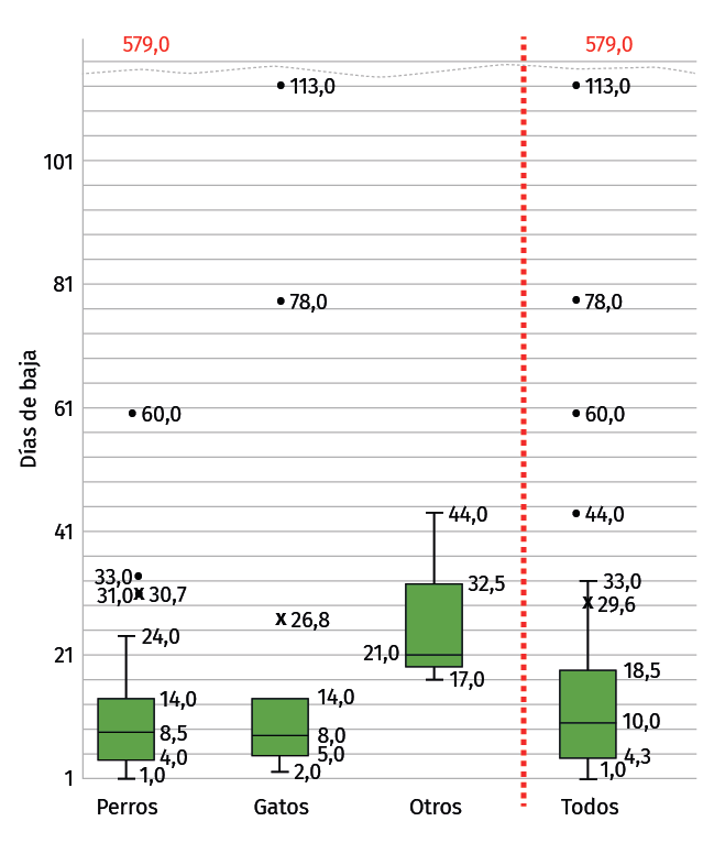 Introduction: animal bites are very frequent, especially in children, but they also affect adults and cause health problems in the workplace. Of all of them, dog bites are by far the most frequent. They cause injuries of a wide spectrum of severity, from superficial erosions to extremely serious wounds that can lead to the death of the victim. Injuries caused by bites in the workplace often cause temporary disability of workers.