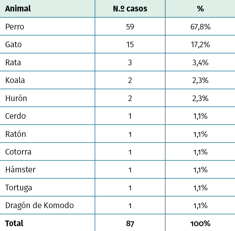 Resultados: en el periodo estudiado se atendieron en urgencias 87 casos de mordedura animal, siendo las más frecuentes las ocasionadas por perros. Los pacientes atendidos realizaban mayoritariamente trabajos relacionados con el cuidado o adiestramiento animal. El 75,8% de las lesiones se produjeron en las extremidades superiores y la mayoría fueron heridas superficiales (73,5%). La antibioterapia fue el tratamiento más empleado (83,9%), siendo amoxicilina-clavulánico el prescrito con más frecuencia. En el 48,2% de los casos fue precisa la baja laboral.