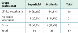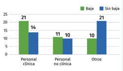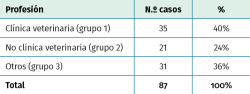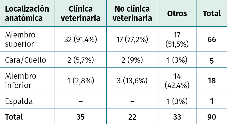 Conclusions: bites are common injuries in professionals related to animal care but also occur in other groups of workers, finding that most are superficial and produced by dogs; they are located mainly in upper extremities. In a high percentage they are treated with antibiotic therapy, with amoxicillin-clavulanic being the most used. The leave of work was precise in almost half of the cases, being more frequent in the staff of veterinary clinics.