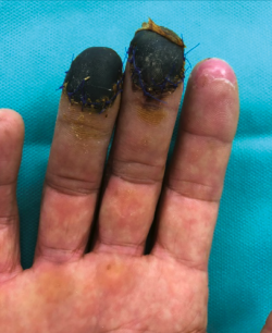 Surgical treatment for multiple finger skin and soft tissue loss represents a challenge for the plastic surgeons. Free flaps used as a temporary syndactyly may be the treatment of choice for this kind of injuries. It provides full coverage of all the finger and hand defects with one single flap, minimal sequelae and fast return-to-work rate.
