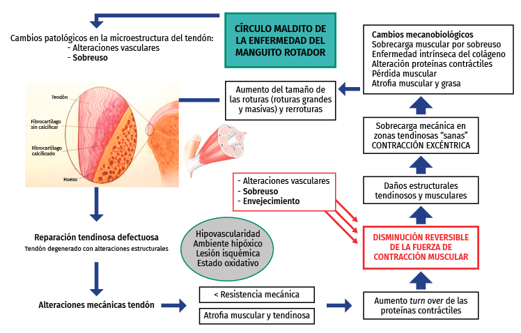 La incidencia de las lesiones de manguito rotador aumenta con la edad a consecuencia del proceso degenerativo que sufren los tendones. Otros factores relacionados con su etiopatogenia son: factores anatómicos locales, factores genéticos, tabaquismo, hipercolesterolemia, tratamiento previo con corticoides, sobrepeso, diabetes mellitus y otras tendinopatías concomitantes.