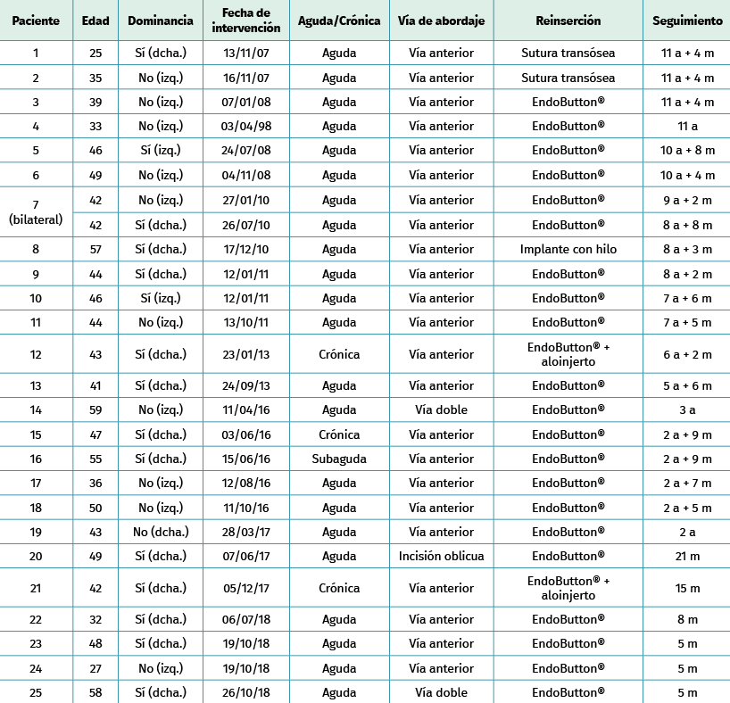 El objetivo de este estudio es evaluar los resultados obtenidos con la técnica empleada en nuestro centro, la reinserción con EndoButton® y abordaje anterior único, en los pacientes intervenidos entre 2007 y 2018, con un periodo mínimo de seguimiento de 5 meses.