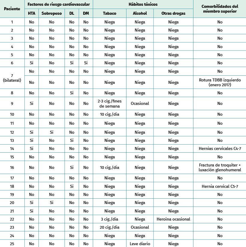 Se realizó un estudio retrospectivo descriptivo de 25 pacientes. Cinco de ellos no pudieron ser entrevistados para este estudio, por lo que se registraron los datos recogidos en la historia clínica hospitalaria. De los 20 restantes, 16 fueron evaluados personalmente con las maniobras exploratorias y los cuestionarios que se describen en el artículo. Los 4 restantes fueron entrevistados telefónicamente.