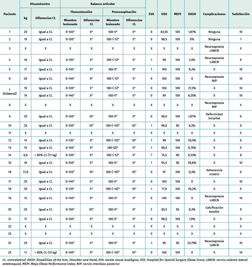 Los resultados en el Hospital for Special Surgery (HSS) Elbow Score y el Mayo Elbow Performance Index (MEPI) fueron de 74,5/80-100; una limitación leve o ausente en el Disabilities of the Arm, Shoulder and Hand (DASH), reconociendo una puntuación media de 0-2 puntos en la escala visual analógica (EVA) del dolor. Aproximadamente el 50% de los pacientes presentaron una limitación de 10-20° para la supinación, notificándose 2 neuroapraxias temporales del nervio interóseo posterior (NIP), 4 del cutáneo lateral antebraquial y una calcificación del tendón reinsertado.