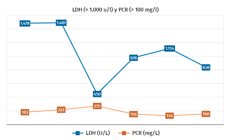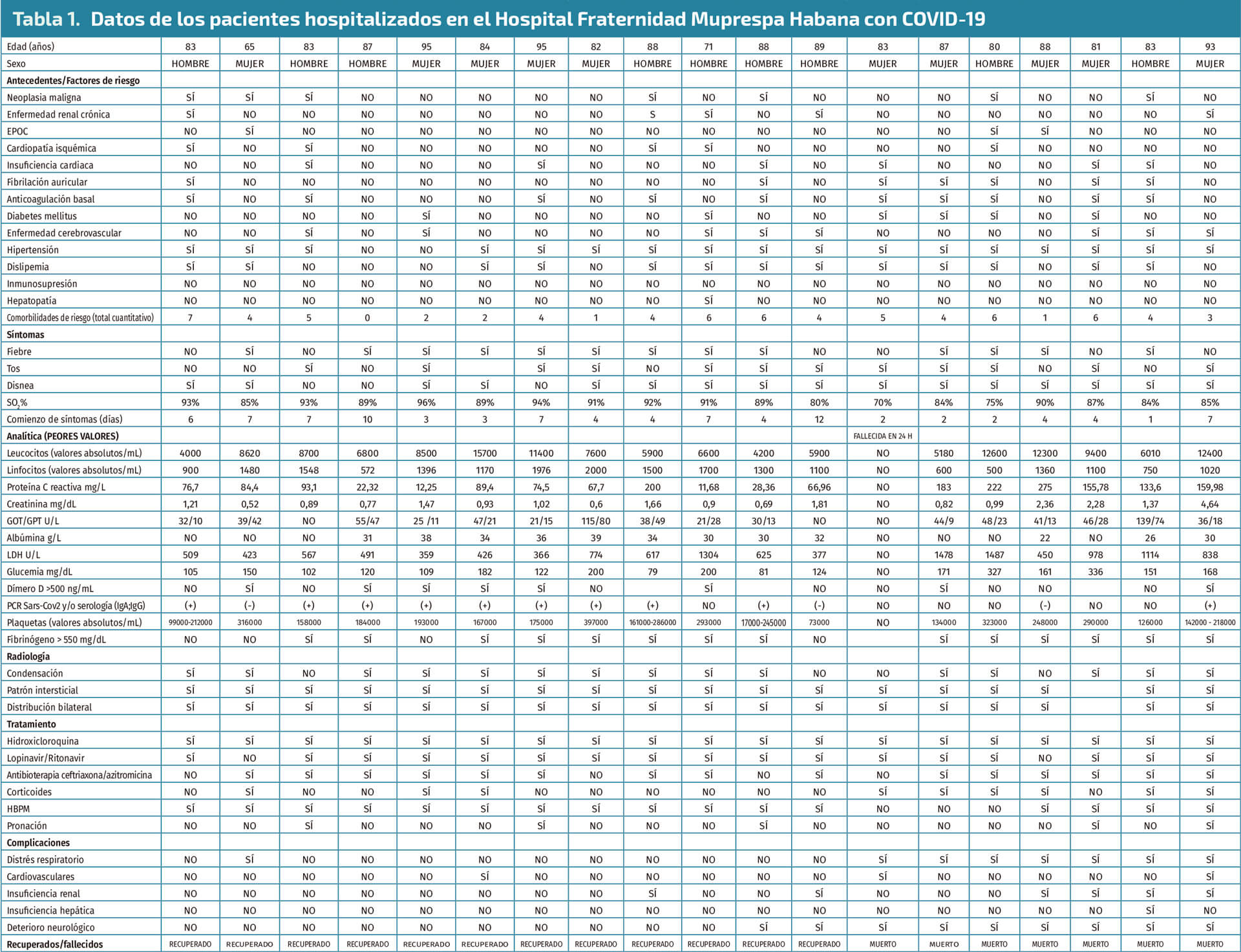 Resultados: del total de 21 pacientes, 2 fueron descartados para este estudio por demostrarse que no padecían COVID-19. De los 19 pacientes restantes, todos ellos con afectación pulmonar severa establecida, 10 eran hombres y 9 mujeres, con un rango de edad entre 65 y 95 años. Fallecieron 7 pacientes (37%), de los cuales 6 tenían 3 o más comorbilidades.
