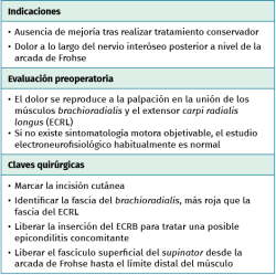 Con la excepción del síndrome del túnel cubital, segunda neuropatía en frecuencia tras el síndrome del túnel del carpo, el resto de las neuropatías compresivas en la extremidad superior son infrecuentes. La base del diagnóstico de esos procesos es la sintomatología y la exploración clínica, con estudios electroneurofisiológicos frecuentemente negativos en los casos de afectación de los nervios mediano y radial, lo que puede inducir a un exceso de diagnóstico de estos procesos al realizar una interpretación inadecuada de la semiología clínica y, por ende, a un manejo inadecuado.