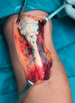 En casos de rotura crónica del bíceps distal, la combinación de la atrofia muscular, la retracción y la fibrosis hace que la reinserción anatómica primaria del tendón sea frecuentemente imposible. Para recuperar la longitud del tendón y evitar contracturas en flexión, la reconstrucción con aumento de injerto se ha propuesto como una alternativa para los casos no susceptibles de reparación primaria. Describimos uno de los dos casos en que hemos utilizado un aloinjerto de Aquiles a través de un vía de Henry modificada para reconstruir el tendón distal del bíceps. Mejorar las molestias, recuperar longitud y restaurar al menos parcialmente la fuerza de flexión y supinación eran nuestros objetivos. Consideramos que estas lesiones crónicas del bíceps distal se pueden reconstruir de forma segura y eficaz utilizando un aloinjerto de Aquiles.