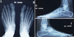 Case report: 53 year old patient reporting pain and deformity in her left midfoot during the last few months. Complementary studies were done such as x-ray, computed tomography and gammagraphy, which showed a pseudoarthrosis in the medial section of the osteotomy.