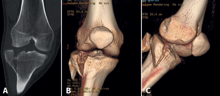Injured knees always undergo anteroposterior and lateral plain radiographs. A CT scan is also essential for diagnosis, fracture pattern characterization (Figure 1), and surgery planning.