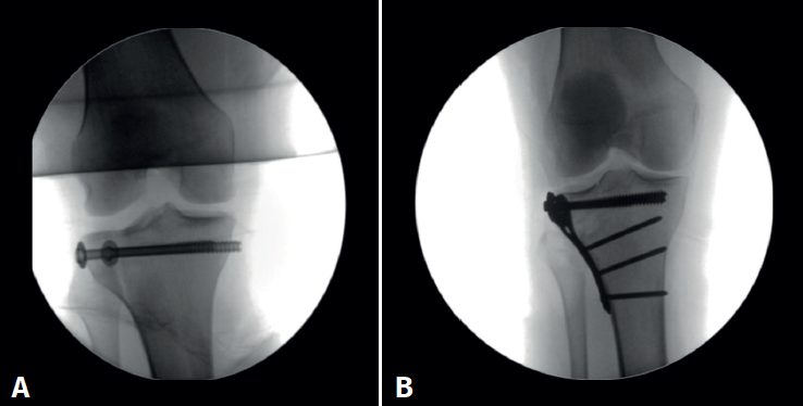 Standard anterolateral and anteromedial portals are created adjacent to the patellar tendon and the joint is visualized with a 30° arthroscope while the knee is insufflated with normal saline. A diagnostic arthroscopy is performed to confirm the TPF, the step-off and the presence of associated lesions (Figure 2). An arthroscopic shaver is inserted into the knee to clear the debris and improve visualization. Next, a small longitudinal anterolateral skin approach is performed, and the fractures are fixed with cancellous screws and/or a buttress plate applied on the external side (minimally invasive plate osteosynthesis), according to the type of fracture diagnosed (Figure 3). Arthroscopy is used to assist reduction and, when needed, to treat soft tissue injuries. The senior authors prefer to perform meniscal repair or partial meniscectomy before bone fixation due to the better visualization of the meniscus. Conversely, ligamentous reconstructions are performed after arthroscopically assisted fixation to ensure bony stability.