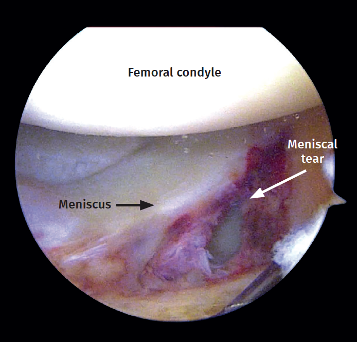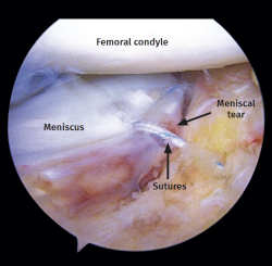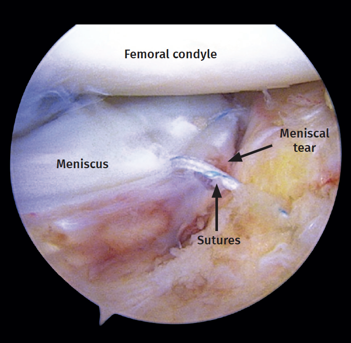 Of the 15 lateral meniscus injuries, there were 9 radial tears treated with partial meniscectomy and 6 peripheral tears that were sutured with a combination of an outside-in and an all-inside technique (Figures 7 and 8).