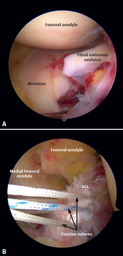 All ligamentous disruptions required arthroscopically assisted reduction and minimally invasive fixation of the fracture followed by ACL reconstruction with a hamstring autograft. The displaced tibial eminence avulsion received arthroscopic treatment with a suture fixation technique (Figure 6B).