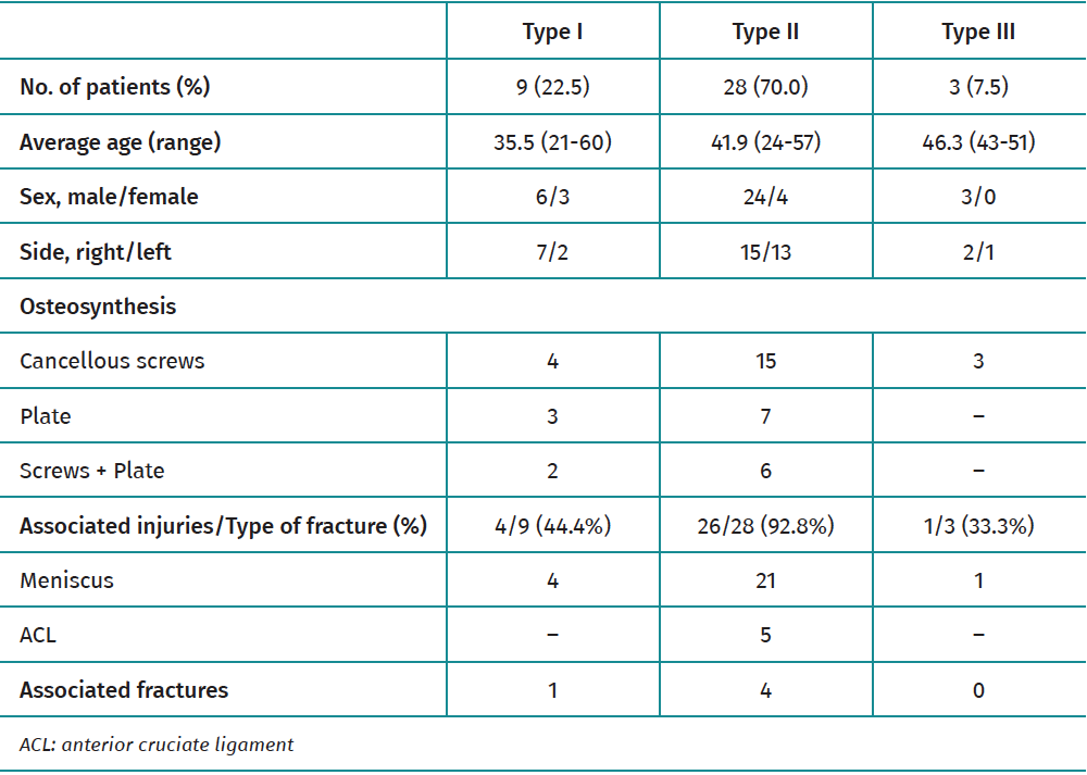 In addition to those found in the knee (12.5%), 5 of the 40 patients with TPF had experienced some other associated fracture and/or some soft tissue damage. All associated injuries corresponded to the type II Schatzker classification (1 femur + wrist fractures, 1 wrist fracture, 1 hand fracture, 1 humerus fracture, 1 forearm fracture, and 1 patient suffered deep facial tissue abrasion).
