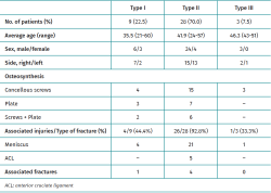 In accordance with the Schatzker classification, 9 type I (split), 28 type II (split and depression) and 3 type III (depression) TPF were identified (Table 1) . No statistical relationship was observed between fracture type and patient age, sex and the injured side.
