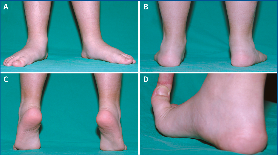 Figura 1. Imágenes de la exploración realizada en un pie plano valgo (PPV) flexible infantil (A y B) y cómo corrige con la maniobra de Rodríguez Fonseca (C) y el test de Jack (D)(6).