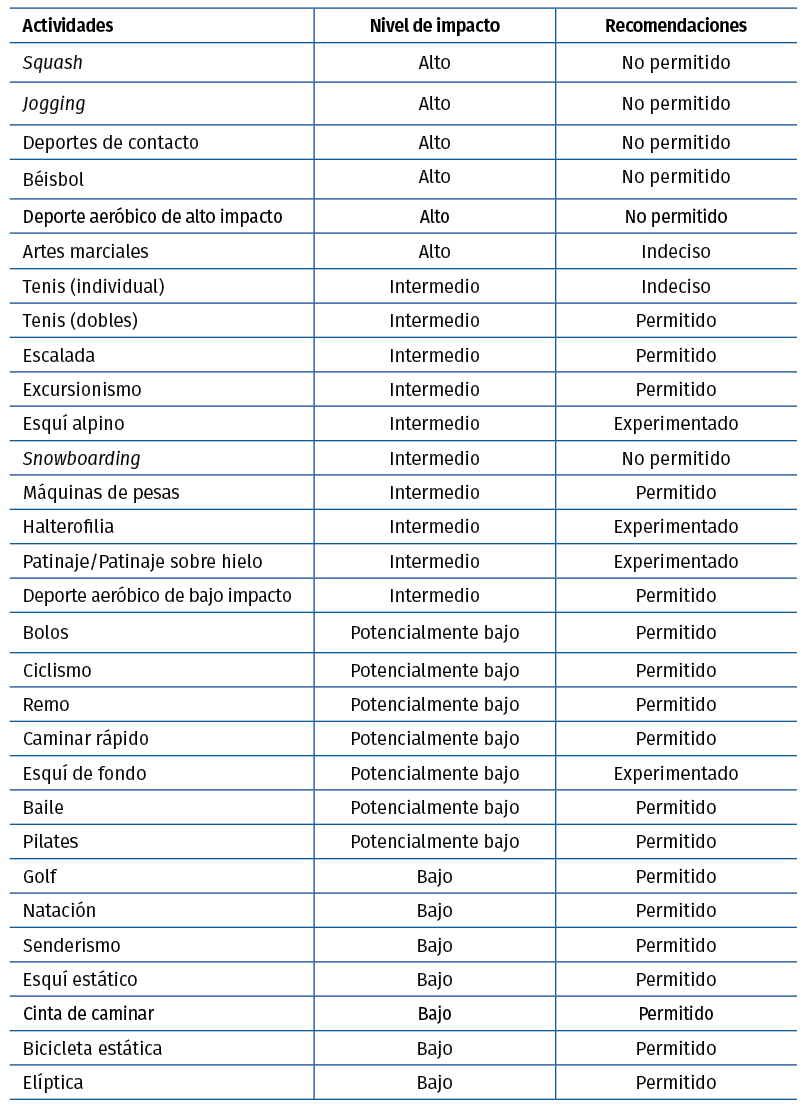 Respecto a la readaptación y el retorno a la actividad deportiva tras la intervención quirúrgica, utilizamos la clasificación de Clifford y Mallon (Tabla 1), diseñada para pacientes intervenidos mediante una artroplastia. Los autores clasifican las actividades deportivas basándose en su percepción del impacto: bajo o potencialmente bajo, intermedio o alto impacto(7).