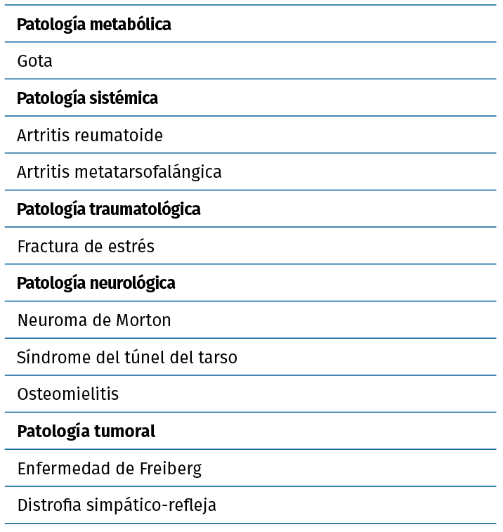 Metatarsalgia is the most frequent reason for consultation that refers to forefoot pain. Its causes can be classified as primary, secondary and iatrogenic, depending on the kind of factors that are involved in its origin.