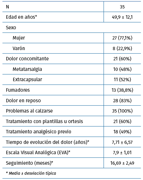 Material y métodos: estudio retrospectivo de pacientes operados de HV con sistema Endolog® entre 2013 y 2014 con un año mínimo de seguimiento. Se valoraron principalmente el ángulo intermetatarsal y el ángulo articular proximal (PASA), criterios radiográficos y el cuestionario de la Asociación Americana de Ortopedia de Pie y Tobillo (AOFAS) como criterio clínico.