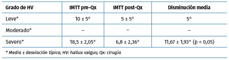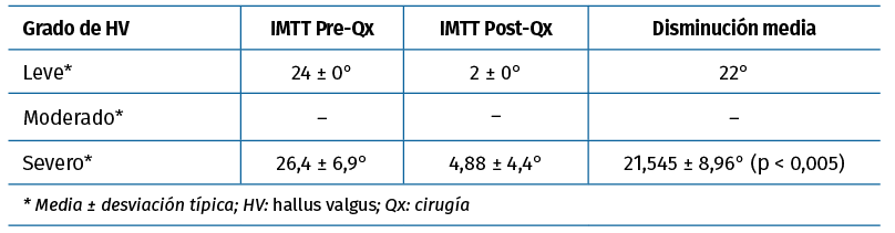 Resultados: se intervinieron 43 pacientes de los que 35 fueron incluidos en el estudio. La media de puntuación AOFAS fue 91,12 puntos en los 12 meses de seguimiento. Las evaluaciones radiográficas postoperatorias mostraron una mejoría estadísticamente significativa en comparación con los valores preoperatorios. La corrección angular media fue 11,3° para el ángulo intermetatarsal y de 21,6° en el PASA. No obtuvimos ninguna complicación.