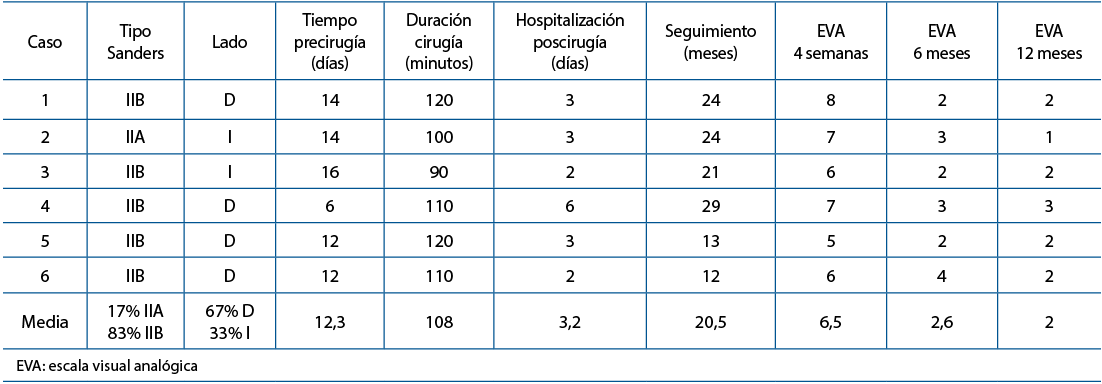 Resultados: se trata de 5 fracturas IIB de Sanders (83%) y una IIA (17%). El tiempo medio hasta la cirugía fue de 12,3 días, la duración media de la cirugía fue de 108 minutos, la estancia hospitalaria media tras esta de 3,2 días. No apareció ninguna complicación inmediata.