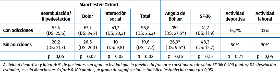 Conclusiones: la presencia de adicciones a sustancias es un factor de riesgo de peores resultados en el tratamiento quirúrgico de las fracturas de calcáneo.