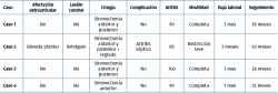 Resultados: fueron intervenidos 4 pacientes (2 hombres y 2 mujeres) con una media de edad de 42 años y un seguimiento medio de 29 meses. El seguimiento mínimo fue de un año. Dos de los pacientes presentaban lesiones condrales asociadas al momento del diagnóstico y un paciente presentaba lesiones extraarticulares. Uno de los pacientes intervenidos presentó un cuadro de artritis séptica que se manejó con limpieza artroscópica y tratamiento antibiótico. Hemos observado un excelente nivel de funcionalidad postoperatoria (AOFAS promedio de 91 puntos). Solo uno de los pacientes presentó recidiva de las lesiones en la RM de control pero sin síntomas asociados. En ningún paciente se realizó tratamiento coadyuvante asociado previo o poscirugía.