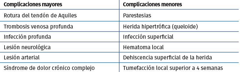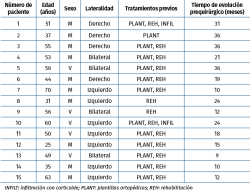 Resultados: el 60% de los pacientes estaban satisfechos o muy satisfechos con el resultado. Once pacientes (73,33%) recomendarían la intervención o se intervendrían el miembro contralateral. Los resultados de la escala EVA pasaron de 8,6 preoperatoriamente a 3,1, lo cual resultó una mejoría estadísticamente significativa. Ninguno de los pacientes presentó complicaciones mayores y solo hubo 2 casos que presentaron un hematoma superficial que se resolvió sin necesidad de reintervenciones o actuaciones adicionales al protocolo postoperatorio habitual. Todos los pacientes menos uno pudieron retornar a su actividad laboral y deportiva previa.