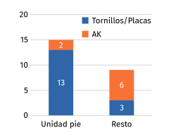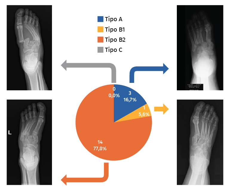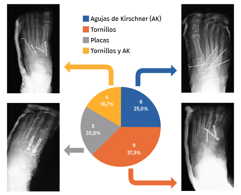 Results: a decrease in the use of Kirschner needles has been observed in recent years, being its use limited to lateral column and patients with cutaneous alterations, with an exponential increase in the use of screws and plates, which seem to offer better rates of reduction and stability. Only one of our patients required secondary arthrodesis. The mean score on the AOFAS scale was 76.23 points. The mean score on the VAS scale was 2.36 points with a high level of satisfaction in nearly all patients.