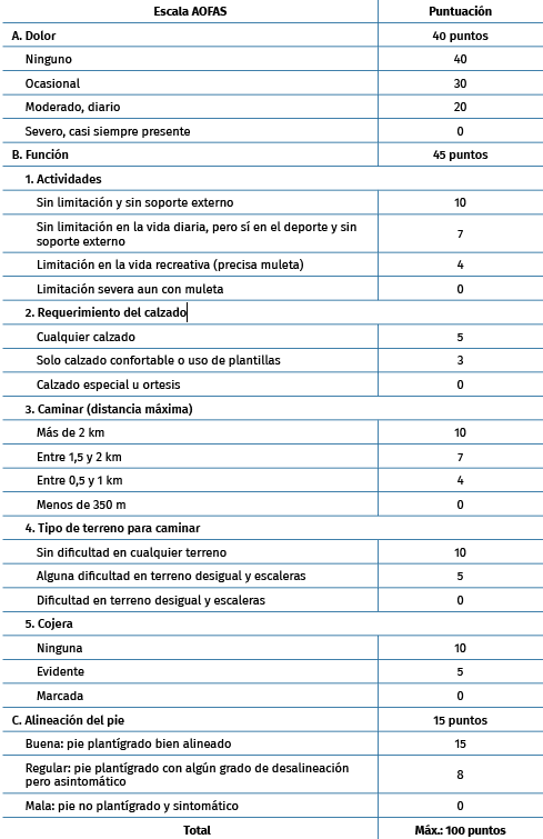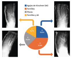 Resultados: se ha objetivado una disminución del uso de agujas de Kirschner en los últimos años, quedando su uso limitado a la columna lateral y a pacientes con alteraciones cutáneas, evidenciando un aumento exponencial del uso de tornillos y placas, que parecen ofrecer mejores tasas de reducción y estabilidad. Únicamente uno de nuestros pacientes precisó artrodesis secundaria. La puntuación media en la escala de la AOFAS fue de 76,23, con una valoración media en la EVA de 2,36 y una satisfacción excelente de los pacientes.