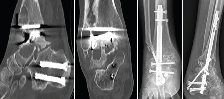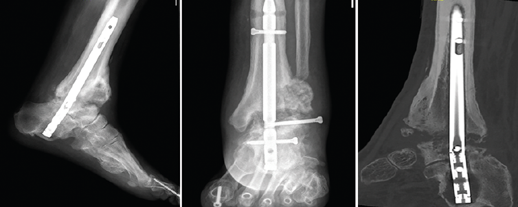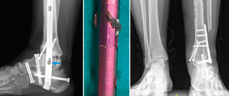 Discussion: to increase the stability after removing the nail, we could use a larger and thicker nail or preferably a locking tibiotalocalcaneal plate.