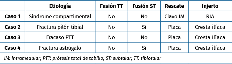Material y métodos: presentamos una serie de 4 casos de rotura del clavo intramedular retrógrado por pseudoartrosis aséptica tibiotalar o subtalar y su técnica de extracción.