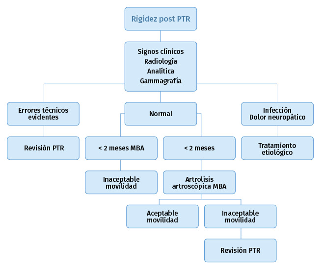 Para un correcto tratamiento se debe identificar la etiología y solo en caso de no tener un diagnóstico de certeza, vamos a reconocer la artrofibrosis como causa de la rigidez, como un proceso de metaplasia del fibrocartílago con incremento de la fibrosis intersticial. En los casos de rigideces precoces, el tratamiento incluye una rehabilitación agresiva con una analgesia adecuada y suficiente.