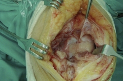 La técnica quirúrgica requiere un orden en el desbridamiento, que se inicia en el espacio intercondilar siguiendo por los recesos medial y lateral hasta llegar a la zona suprapatelar, donde reside la primera causa de limitación de la flexión. En caso de persistir la limitación de la extensión, se accede al compartimento posterior para liberar e incluso desinsertar la cápsula posterior.