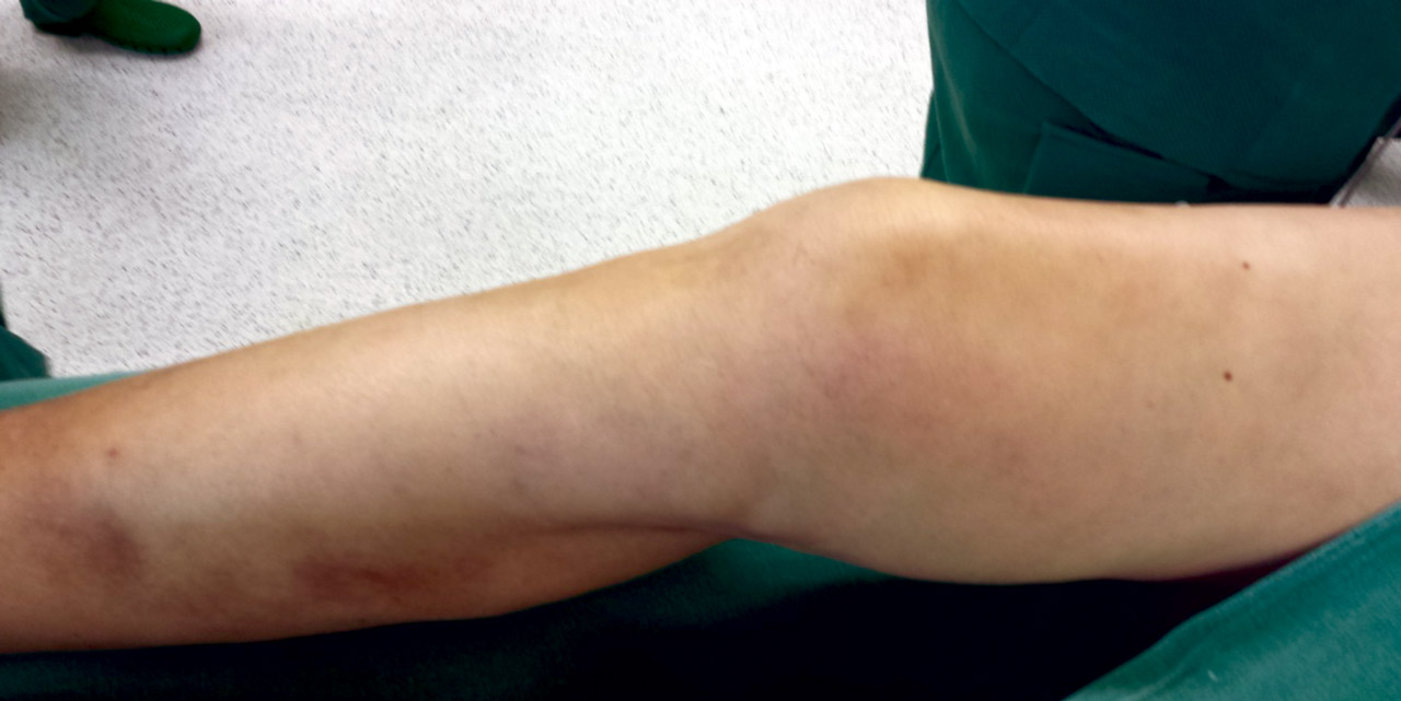 Se trata de un varón de 35 años (caso 1) y una mujer de 70 años (caso 2) remitidos a consultas de traumatología ante la persistencia de masa fluctuante en el territorio glúteo mayor en el primer paciente y en la cara medial del tercio distal del muslo derecho en la segunda (Figura 1). En ambos casos se describió un antecedente traumático de meses de evolución. No asociaron lesiones cutáneas ni parestesias en el territorio de distribución. De manera inicial, se trató de forma conservadora mediante antiinflamatorios no esteroideos (AINE), compresión y reposo, sin presentar mejoría sintomática. La ecografía realizada en la segunda paciente demostró una colección líquida de 35 × 8 × 3 cm, desde el tercio distal del muslo hasta el tercio proximal de la pierna derecha. En la ecografía la localizamos entre el plano subcutáneo y la fascia muscular. Era prácticamente anecoica en toda su extensión y con presencia de septos.