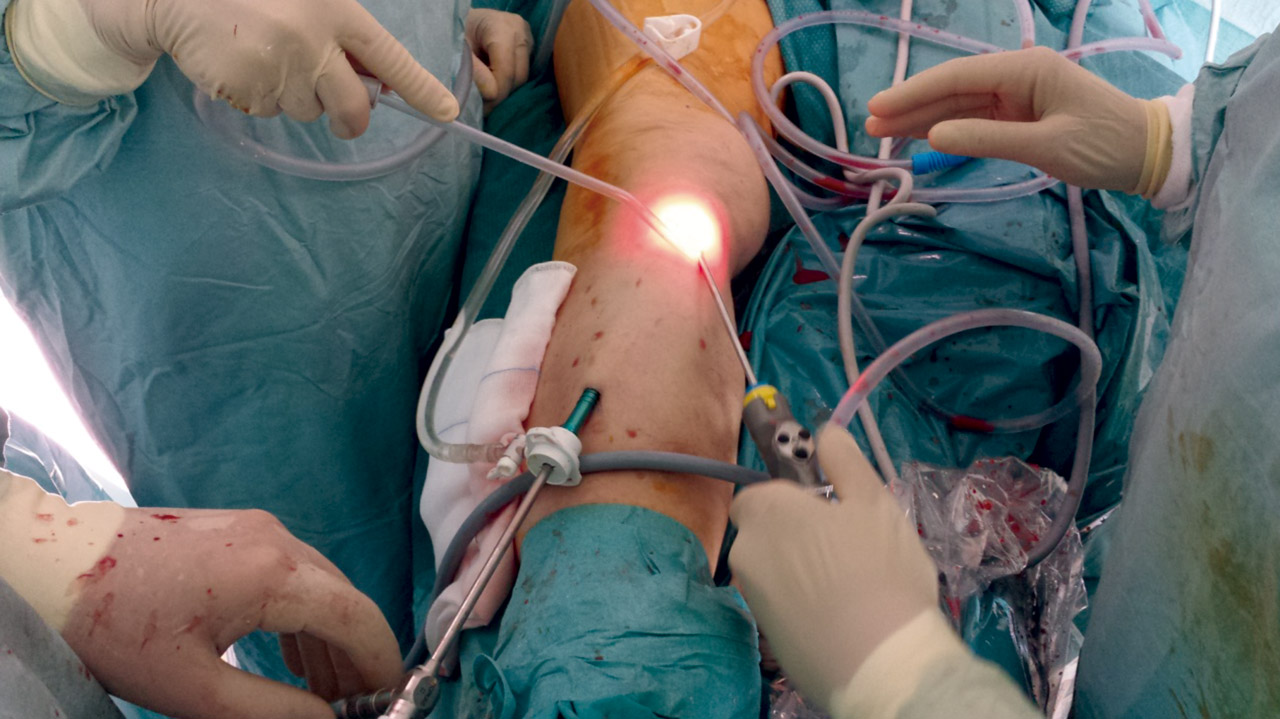 En ambos casos, tras el fracaso del tratamiento conservador mediante reposo y vendajes compresivos, se realizó una evacuación percutánea por punción guiada con ecografía, con reaparición de la clínica tras 1 mes de evolución. Ante esta situación, se decidió tratamiento quirúrgico bajo anestesia raquídea, a la visualización directa de las lesiones mediante endoscopia (óptica de 70° de cadera) (Figura 2), comprobando el contenido líquido seroso de esta, así como la presencia de septos y neocápsula, tomando muestras para estudio anatomopatológico). Mediante la utilización de un sinoviotomo, se procedió al curetaje de los septos y la neocápsula hasta conseguir un lecho sangrante (Figura 3). Por último, se irrigó la cavidad con 500 mg de doxiciclina como agente esclerosante diluidos en el último suero de lavado endoscópico. Como tratamiento complementario, se aplicó un vendaje compresivo y se mantuvo un drenaje de tipo redón durante su ingreso hospitalario (Figura 4).