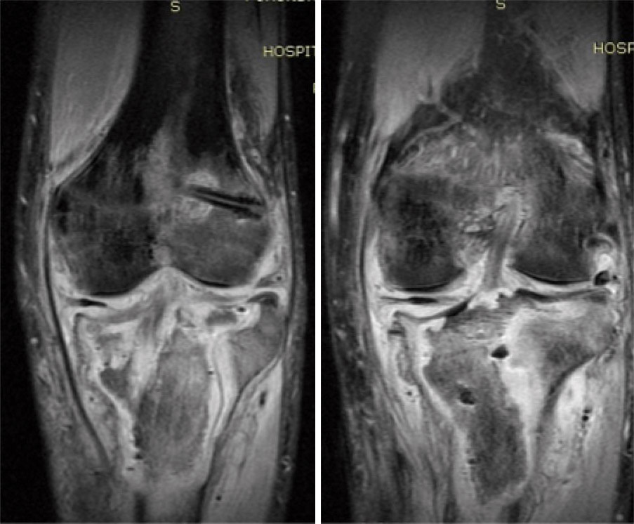 El paciente no presenta mejoría, por lo que un mes después se decide realizar una resonancia magnética de la rodilla, donde se observa abundante derrame y una región de secuestro óseo que ocupa la epífisis y la metáfisis proximal de tibia (Figura 1).