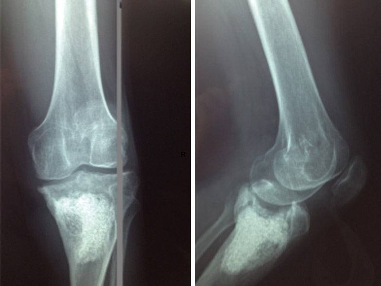La evolución fue favorable, mejorando la clínica y los parámetros analíticos, resolviéndose la infección y consiguiendo una extensión de –5° y flexión de 95°, aunque persiste un defecto óseo epifisometafisario proximal en tibia izquierda, como se observa tanto en la radiografía como en la TC que se le realizaron tras un año de evolución, donde además se aprecia una artrosis femorotibial incipiente (Figuras 2 y 3).