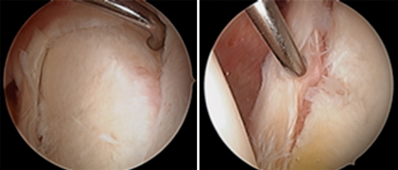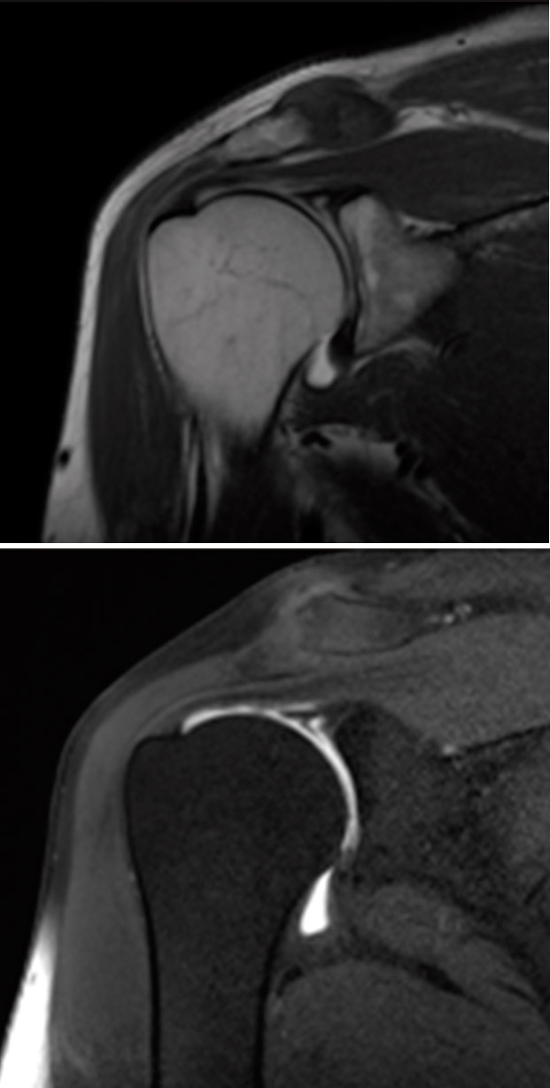 A la exploración física se evidenció movilidad completa, maniobras negativas para lesión de manguito de rotador o patología de articulación acromioclavicular. La exploración física fue positiva y compatible con lesión de SLAP (superior labrum anterior to posterior), confirmada con la artrorresonancia magnética (artro-RM) y diagnosticada como SLAP de tipo II; se programó para reparación artroscópica (Figura 1).